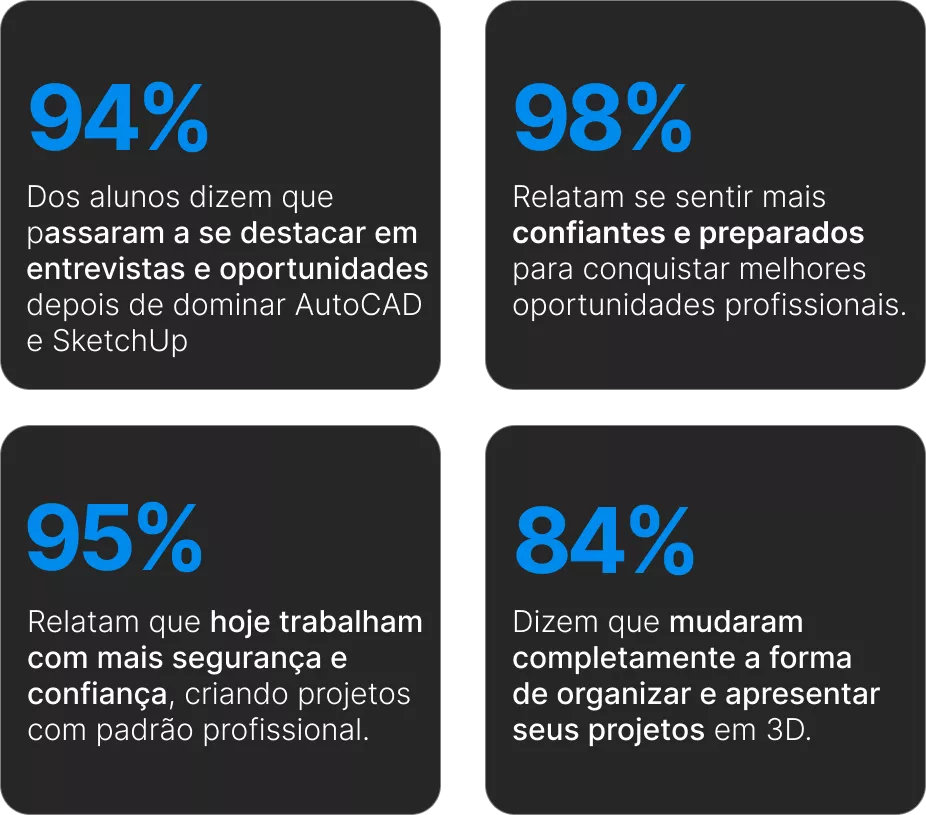 O Curso de AutoCAD + SketchUp foi criado para quem tem dificuldade em desenvolver projetos técnicos ou 3D, perde tempo com tutoriais soltos ou quer apresentar trabalhos com padrão profissional. Ele é indicado para qualquer pessoa que queira aprender a projetar de maneira prática e eficiente, conquistando mais segurança e destaque na área.