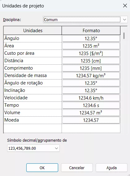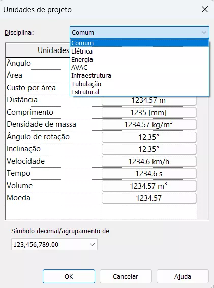 Já será aberta a janela de Unidades do Projeto, onde é possível alterar o ângulo, área, custo por área, distância, comprimento, densidade, rotação, inclinação, velocidade, tempo, volume, moeda e também o símbolo decimal (estando na disciplina comum/padrão).