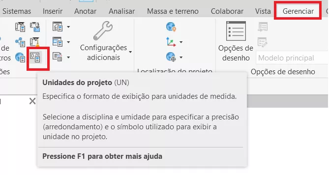 Na guia GERENCIAR encontramos a funcionalidade para configurar as Unidades do Projeto, que também pode ser acionado pelas teclas de atalho UN