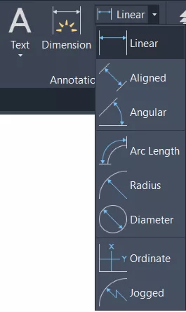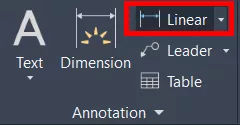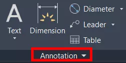 Facilmente conseguimos ver o painel das cotas no AutoCAD, ele fica localizado na guia Home (Pagina Inicial), no painel Annotation (Anotações), onde temos as opções de funcionalidades de cotas, textos, marcações e tabelas.