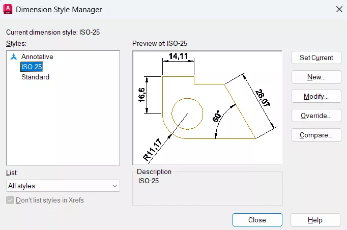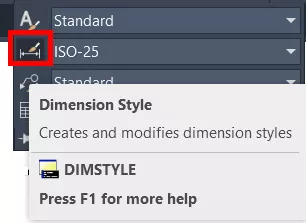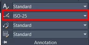 No painel de Annotation (Anotações), conseguimos clicar na seta para expandir as informações, e vemos como segunda opção o estilo de cota que estamos utilizando em nosso arquivo (por padrão do AutoCAD, três tipos de cotas aparecem: ISO-25, Annotative e Standard).