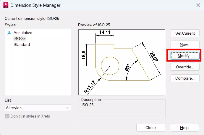 Clicando em Modify (Modificar) será aberto o modificador de estilo de cota, que é o local onde fazemos todas as configurações necessárias de uma cota, seja em relação das suas linhas, símbolos, flechas, texto, ajustes, unidades e tolerâncias.