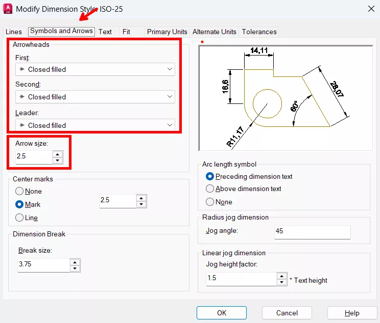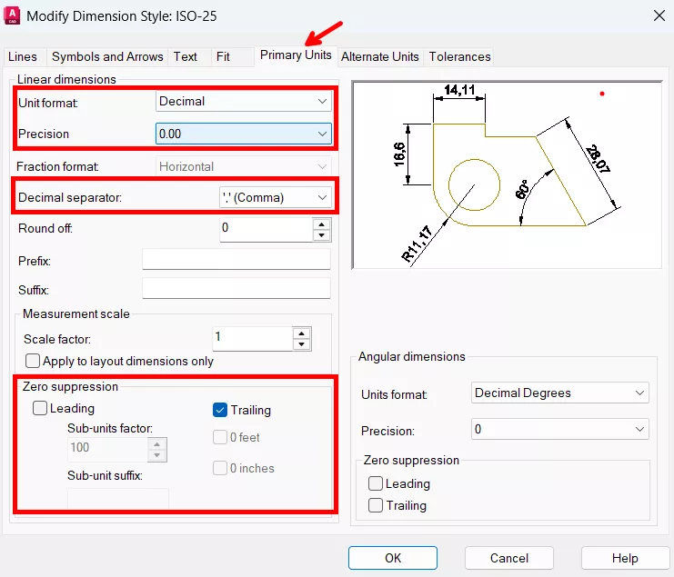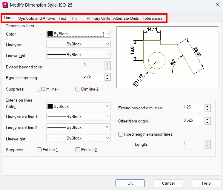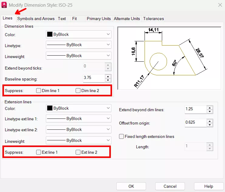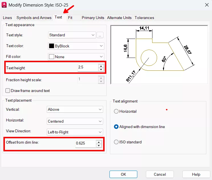 - Offset from dim line: deslocamento/distância entre a linha da cota e o texto da cota.