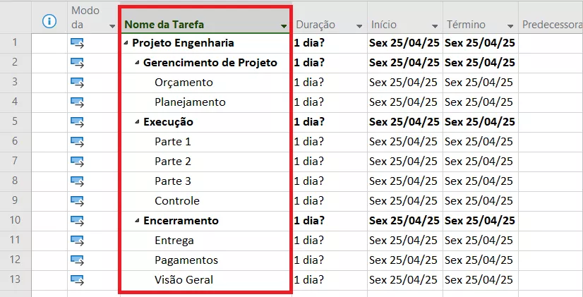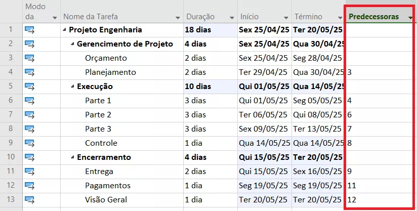 Para organizar a ordem de execução, utilize a coluna Predecessoras para indicar quais tarefas devem ser concluídas antes do início de outras. Isso cria vínculos lógicos e dá mais realismo ao cronograma.