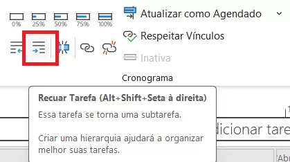 Lembre-se de manter uma ordem lógica e de quebrar tarefas maiores em subtarefas, se necessário (Recuar Tarefas à direita).