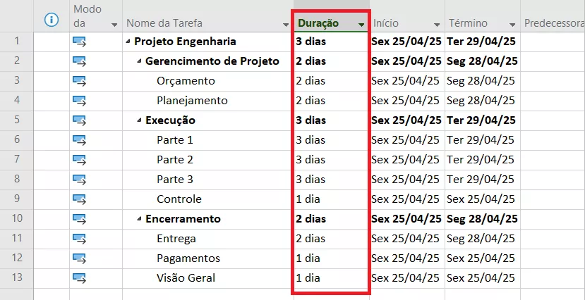 Na coluna Duração, informe o tempo estimado para a execução de cada atividade. O MS Project calculará automaticamente as datas de início e término com base nessas informações.