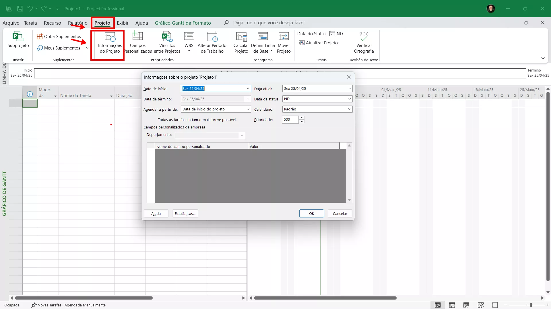 Clique na guia Projeto e depois em Informações do Projeto. Aqui você pode ajustar a data de início do projeto, o calendário padrão e outras configurações importantes.