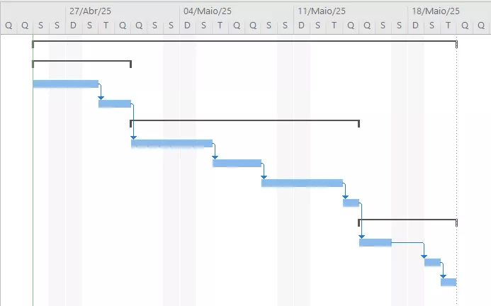 À medida que você insere as tarefas e vínculos, o gráfico de Gantt será gerado automaticamente no lado direito da tela. Ele permite visualizar o cronograma de forma clara, destacando o tempo de cada atividade e a linha do tempo geral do projeto.