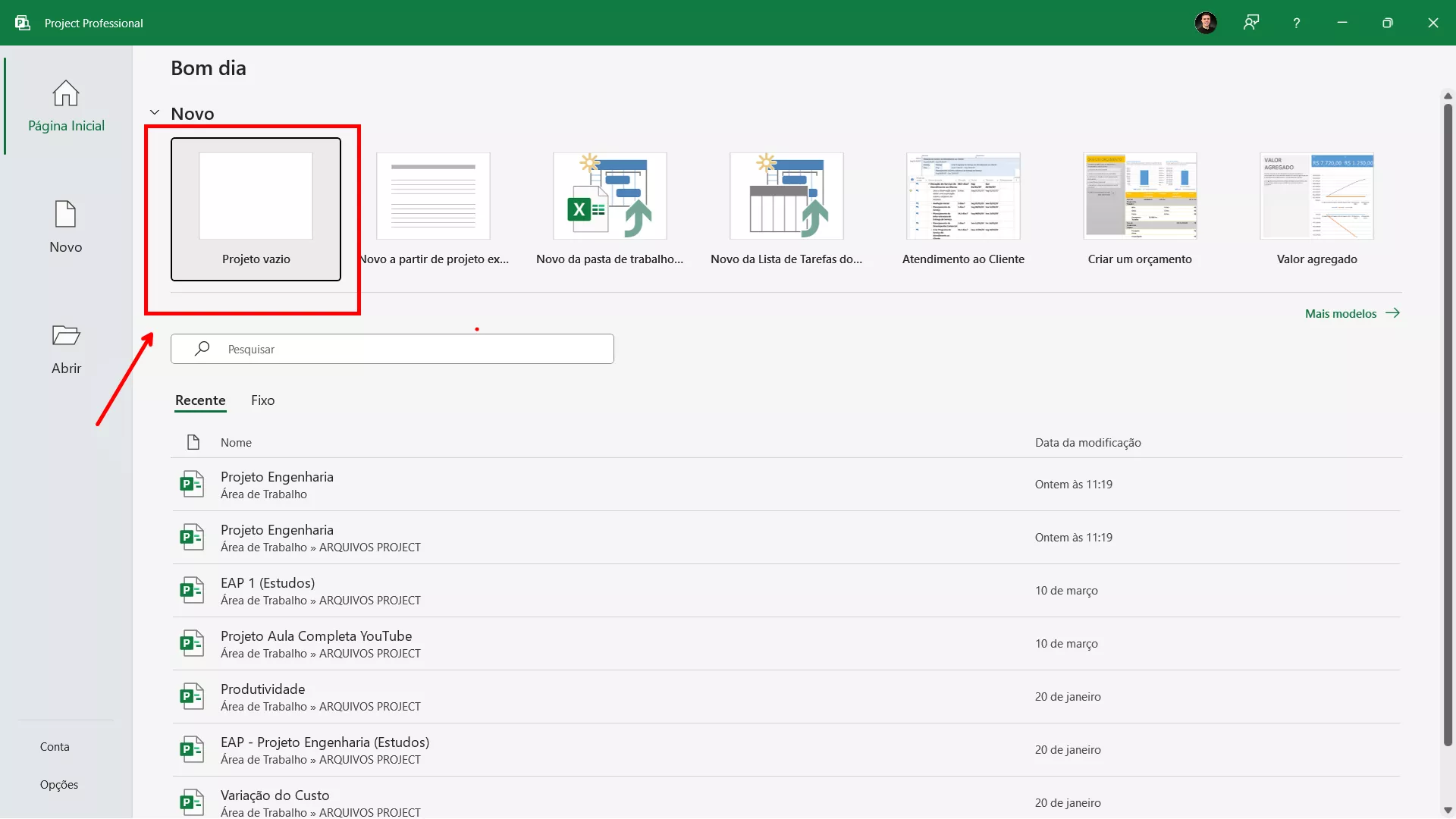 Abra o Microsoft Project e selecione a opção para iniciar um novo projeto em branco. Antes de mais nada, salve o arquivo com um nome claro e objetivo, relacionado ao projeto que está sendo planejado.