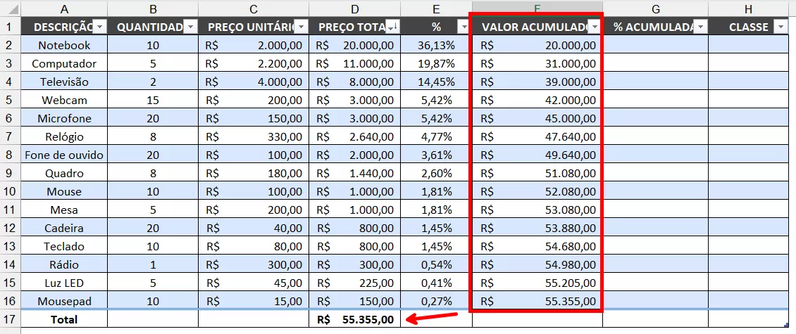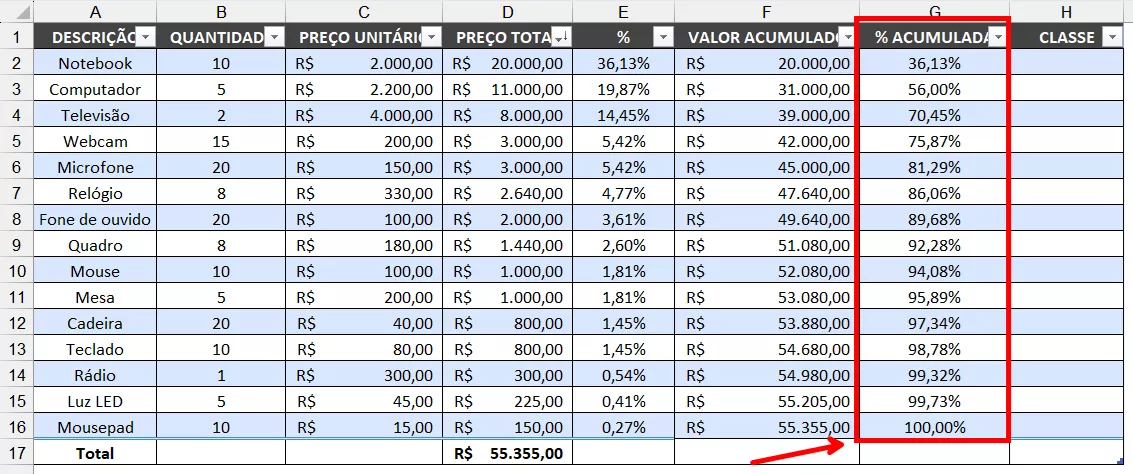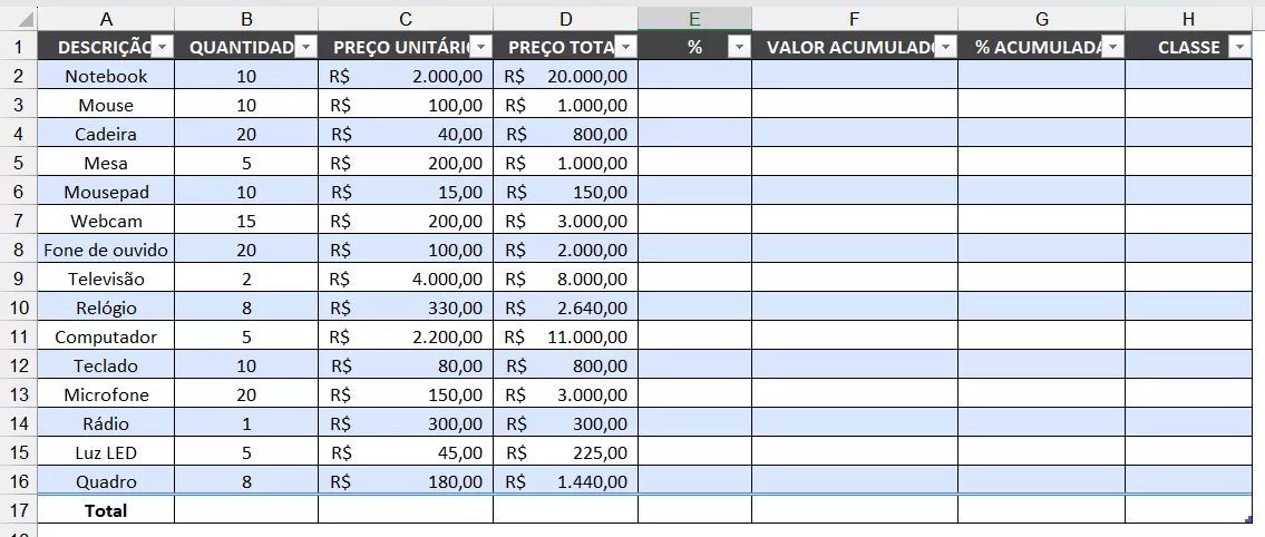 É muito importante termos uma tabela organizada como no exemplo abaixo, com as colunas de Descrição, Quantidade, Preço Unitário, Preço Total, Porcentagem, Valor Acumulado, Porcentagem Acumulada e Classe: