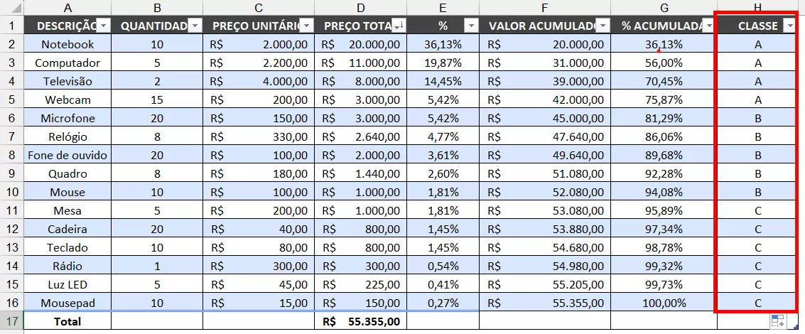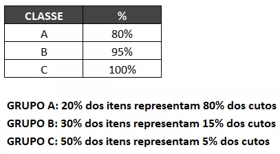 Como pudemos ver no exemplo anterior, tínhamos uma tabela com 15 itens, e após classificar cada um deles entre Classe A, Classe B ou Classe C, conseguimos visualizar que existem 4 itens que são mais importantes do que os outros, são eles: