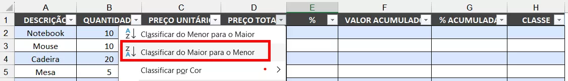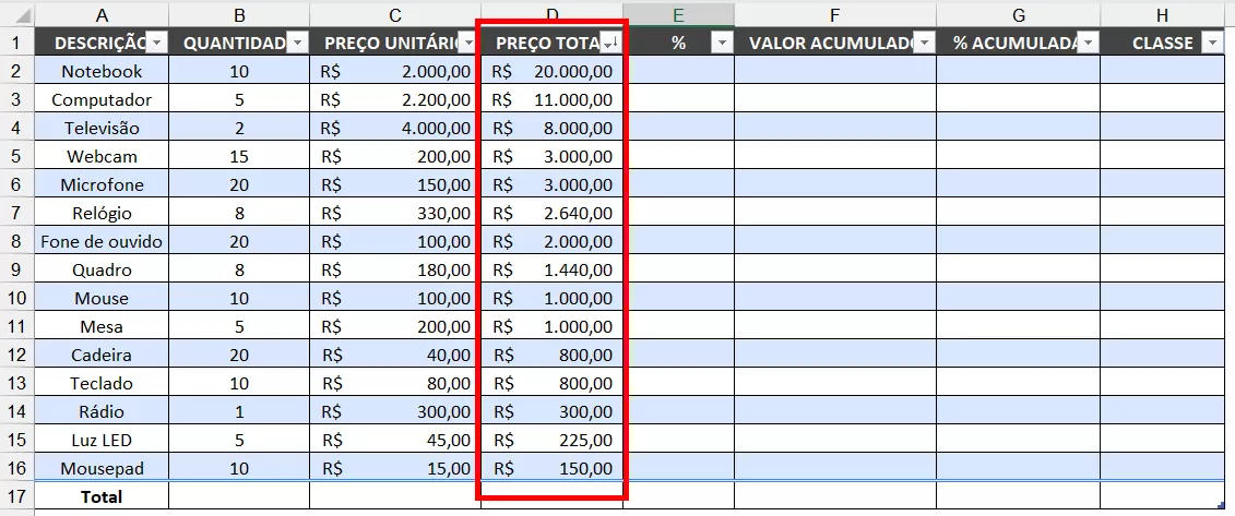 O primeiro passo é classificar a sua tabela do valor MAIOR para o MENOR de acordo com o Preço Total, dessa maneira os itens mais caros vão ficar em cima, e os mais baratos em baixo. Lembrando que a sua tabela deve estar com o FILTRO aplicado no Excel.