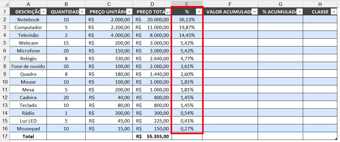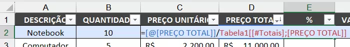 A próxima coluna que vamos preencher é a de Porcentagem (%), que será a divisão do Preço Total de cada item, pelo Total previamente calculado.