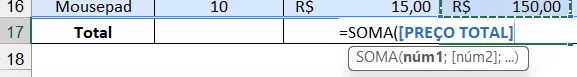 O próximo passo é calcular uma linha de Total, somando a coluna do Preço Total. Para isso vamos utilizar a função SOMA do Excel: