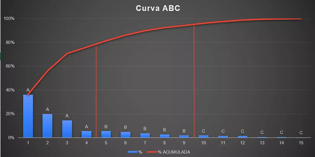Na prática, a Curva ABC organiza os itens em três categorias principais: A, que representa os itens mais críticos ou de maior valor; B, que inclui itens de importância intermediária; e C, que cobre itens de menor relevância ou impacto.