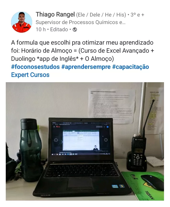 "Recentemente eu terminei o Curso de Excel da Expert Cursos, eu já utilizava o Excel, mas graças ao curso eu pude aprender coisas que eu tinha esquecido e diversas coisas novas. Me sinto muito mais preparado para fazer Planilhas, Tabelas e Dashboards e depois de muito tempo consegui atualizar o meu currículo".