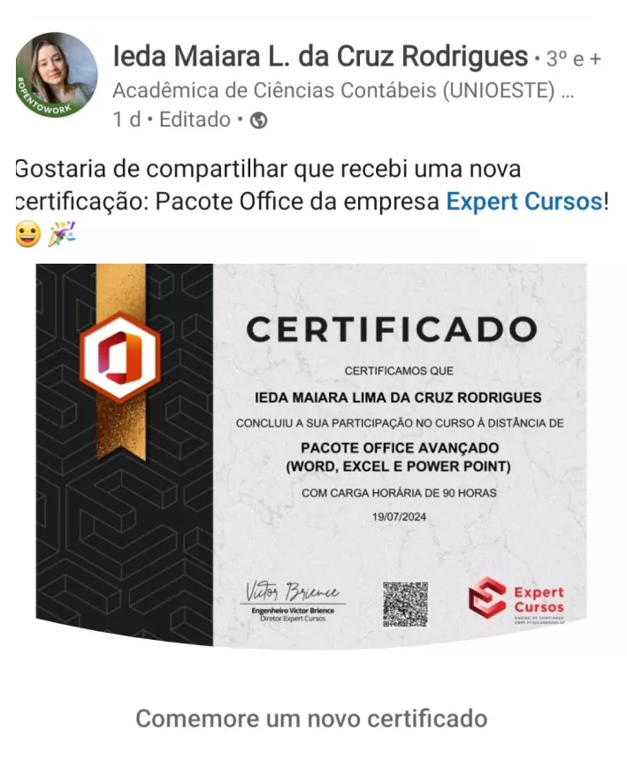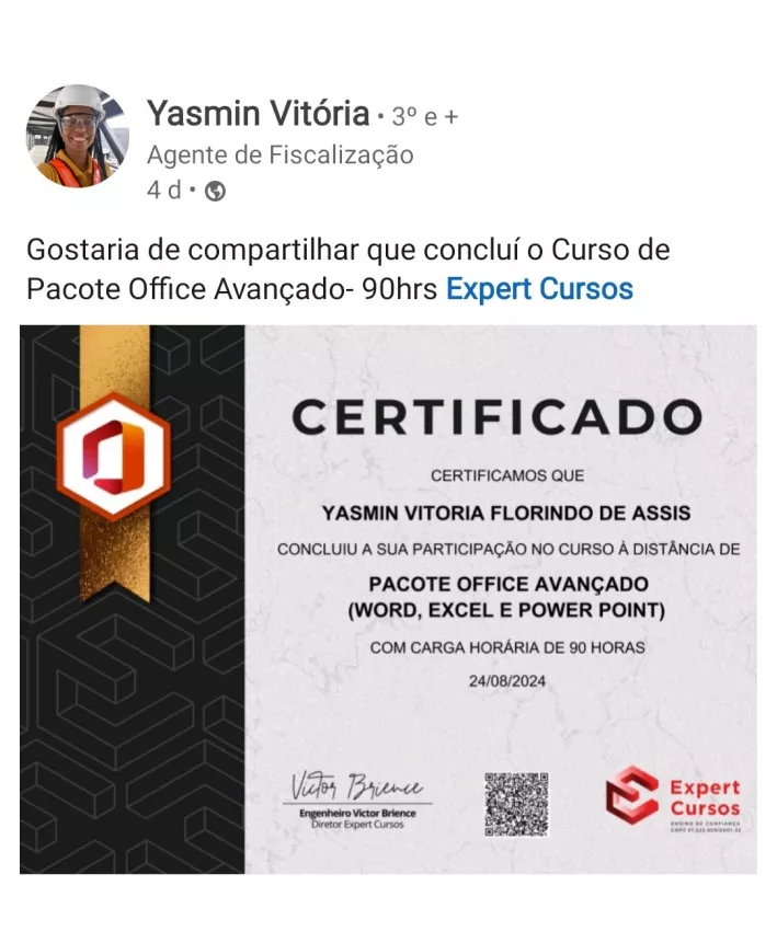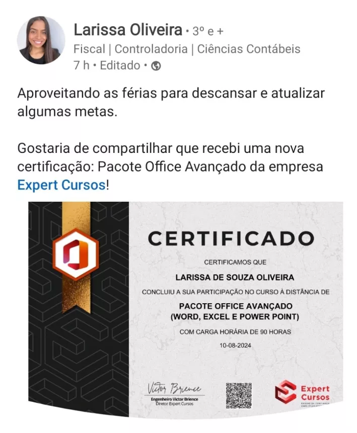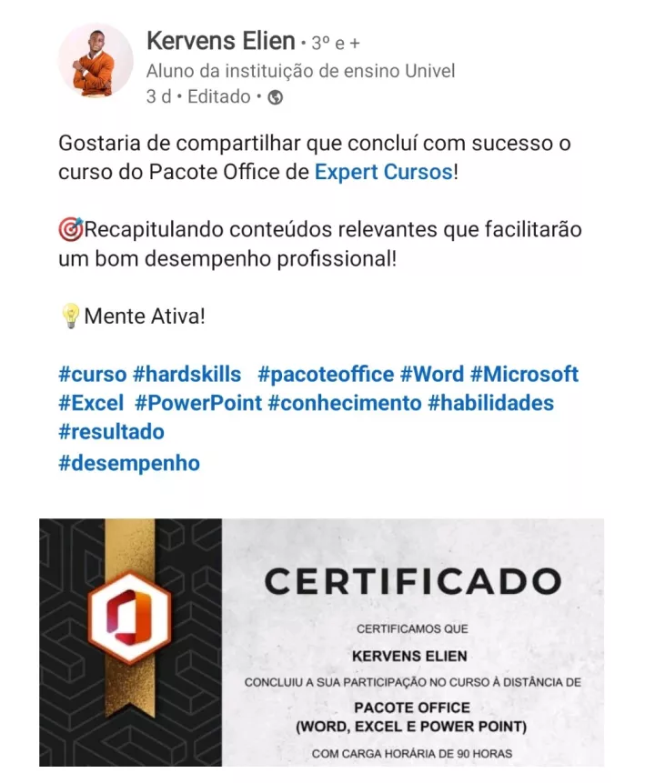 "Recentemente eu terminei o Curso de Excel da Expert Cursos, eu já utilizava o Excel, mas graças ao curso eu pude aprender coisas que eu tinha esquecido e diversas coisas novas. Me sinto muito mais preparado para fazer Planilhas, Tabelas e Dashboards e depois de muito tempo consegui atualizar o meu currículo".