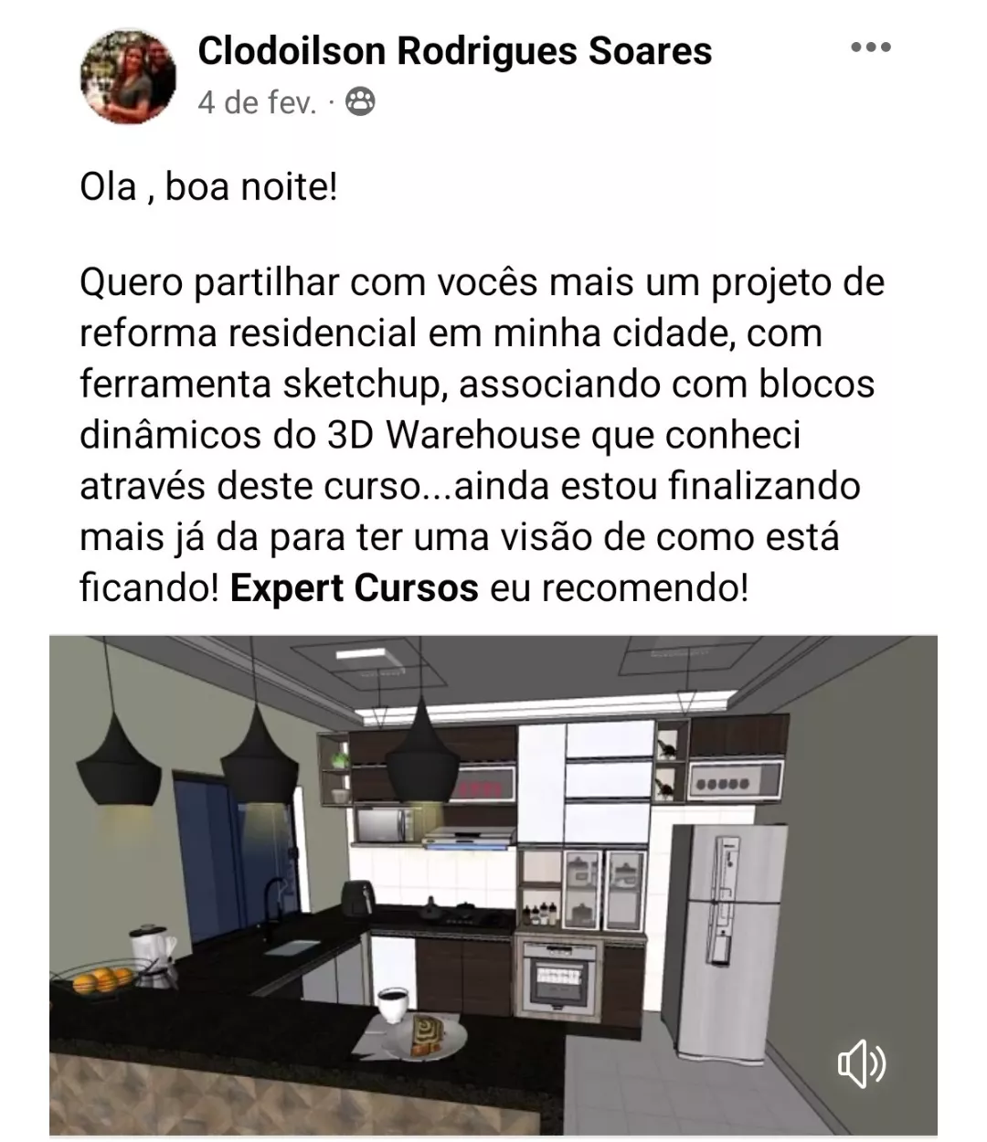 "Trabalho com reformas e o Curso de SketchUp tem me ajudado muito, em criações, apresentações e projetos 3D. No começo pensei que teria muita dificuldade de trabalhar com esse software, mas no decorrer das aulas e ao praticar consegui dominar bem o programa, foi mais fácil do que eu pensava."