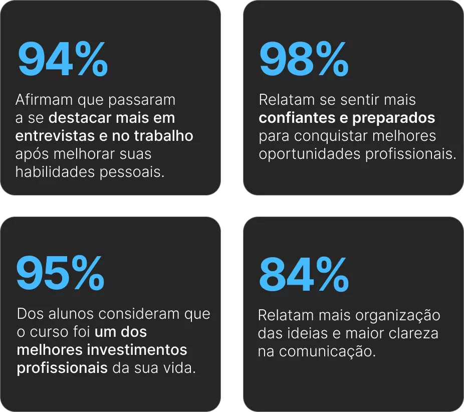 O Curso Online de Soft Skills foi criado para você dominar as principais habilidades comportamentais de forma 100% prática, economizando tempo com aulas diretas e objetivas.